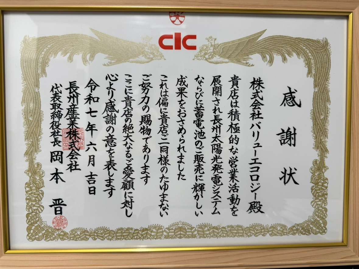 "長州産業株式会社"様 感謝状